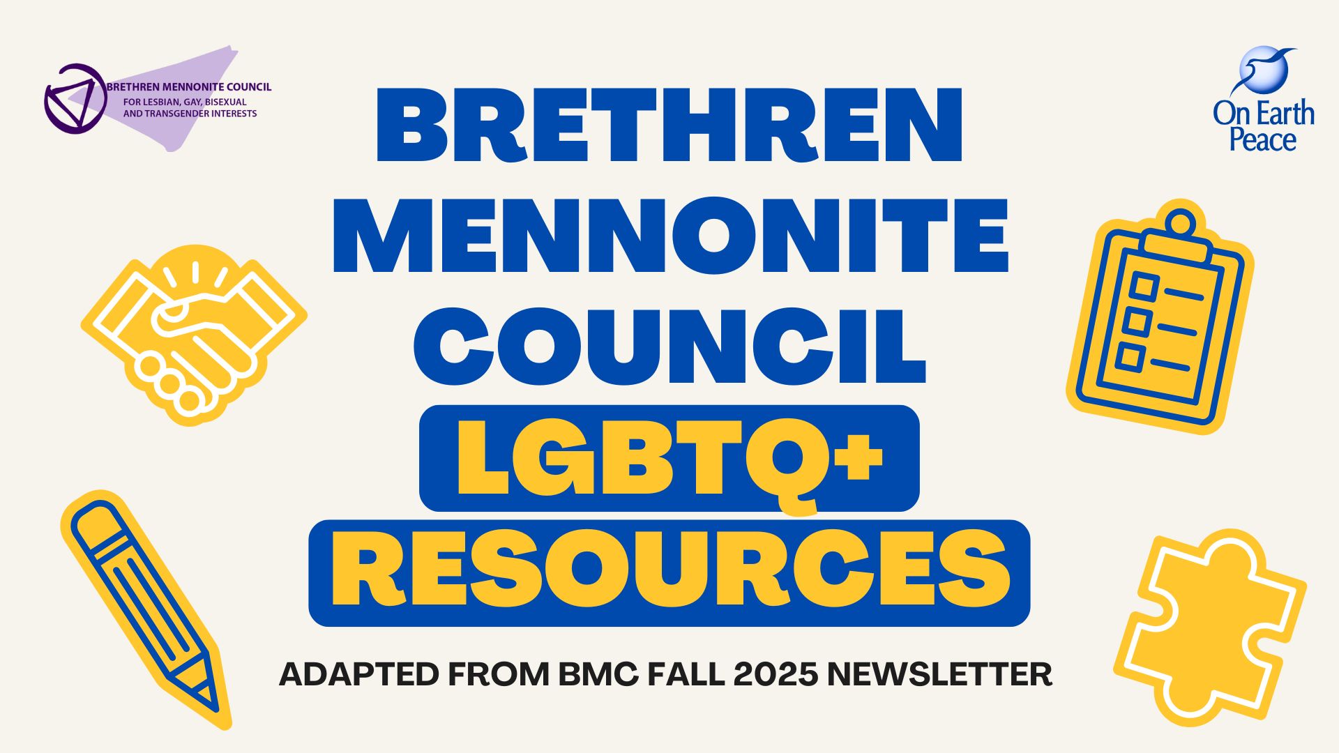 Our brothers and sisters at the Brethren Mennonite Council (BMC) for Lesbian, Gay, Bisexual and Transgender Interests share some wonderful resources in their Fall 2025 newsletter. Advocates of the LGBTQ+ community can utilize the resources to support the work of challenging harmful systems and proclaiming, “the sacred worth of queer, trans, and gender-expansive people connected to Mennonite and Brethren traditions.” The BMC has been doing this work since its formation in 1976, supporting LGBTQ+ members and their families in Brethren and Mennonite churches.
